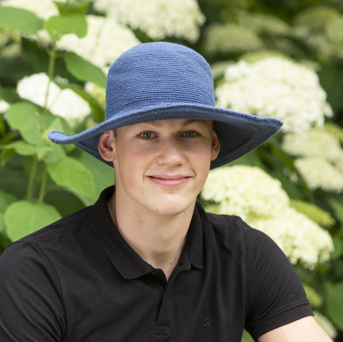 ‘n Hoed voor hem en haar. 100% katoen, handgemaakt op Bali. UPF 50+ UV-bescherming. De rand is 12 cm. de hoed is plat op te bergen. De twee kunststof baleinen houden de vorm vast die u wenst. Bij hoge temperaturen kunt u de hoed nat dragen, heerlijk verkoelend.