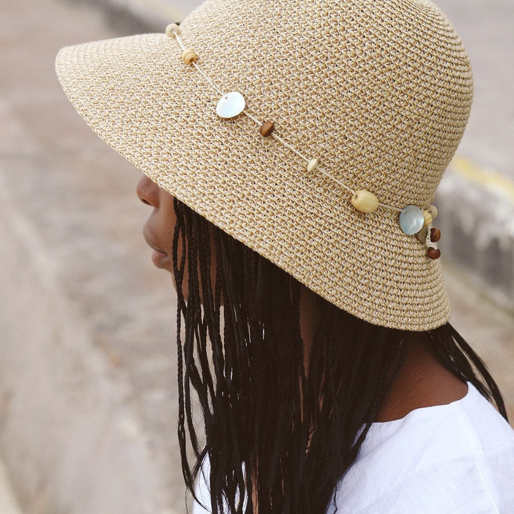 De Gatsby Bucket heeft een koortje met kralen rondom de kroon, aan de achterkant geknoopt, wat dit ontwerp een speelse uitstraling geeft. Deze Bucket hoed met brede rand geeft uitstekende zonbescherming en is makkelijk te dragen, of je nu op het strand zit, geniet van een picnic in het park of geniet in je eigen tuin.